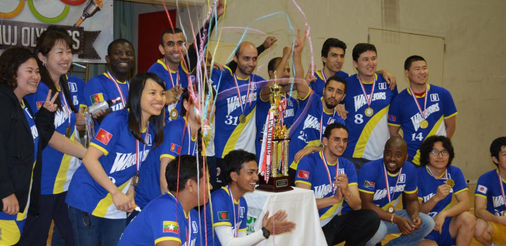 A successful IUJ Olympic was held from May 15 through May 27.  This is an annual event which is held in the evenings after classes and on weekends, organized by Graduate School Organization Executive Committee (GSO-EC).  A total of 8 multi-cultural teams (25 members per team) which are formed by mainly students included staff, alumni and outsiders aimed for victory over 15 various events.  “Team Warriors” won the overall victory this year as well as last year, the gold medals and a trophy were awarded.