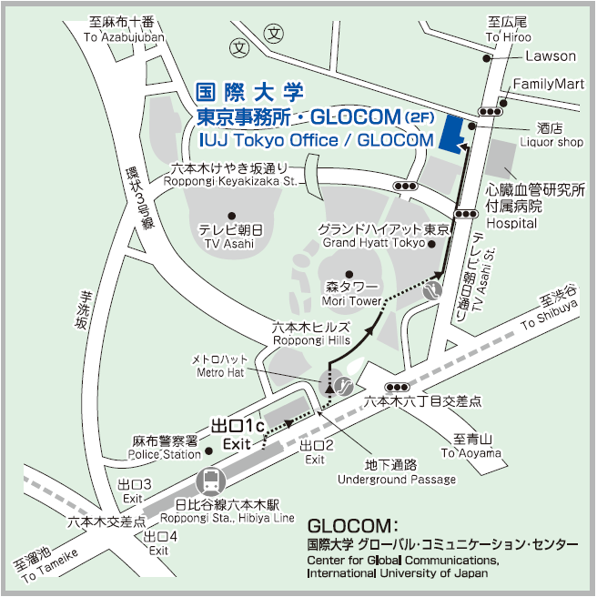 4. Go straight past the stoplight at the corner of the Grand Hyatt Hotel. The Harks Roppongi Bldg. (IUJ Tokyo Office and GLOCOM is on the 2F) will be on the left before the next stoplight. To find the elevator, veer to the right after entering the main entrance Go to the 2F.