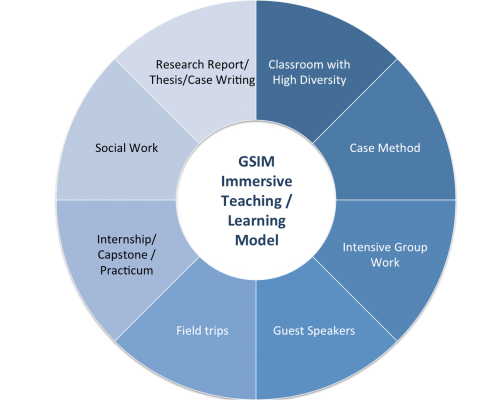The GSIM Teaching/Learning Model is complemented by eight major components as outlined in the Figure below. Though there are still many traditional lecture type classes, these classes include interactive activities such as student presentations analyzing companies and other organizations both from inside and outside Japan. For the core courses, teaching assistants are recruited from among students to supervise the learning of students and oversee exams. The Case Method is being increasingly used both for qualitative and quantitative courses. Students are challenged with intensive group work, 4-5 guest speakers every academic term, 3 or 4 major field trips a year plus several short study tours by class instructors. Carefully designed opportunities for volunteer/social work assure continuous engagement and exposure.