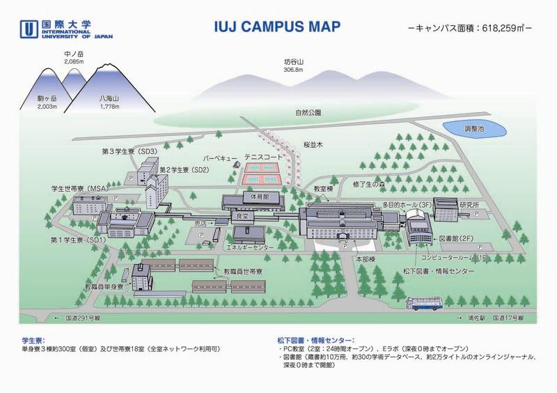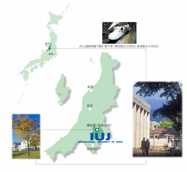 国際大学(IUJ)は魚沼コシヒカリで有名な新潟県南魚沼市にあります。平成16年11月1日に六日町と大和町が合併して南魚沼市が誕生、その後平成17年10月1日に塩沢町も加わり、現在の南魚沼市となりました。人口5万6千人。平成21年のNHK大河ドラマ「天地人」の主人公、直江兼続ゆかりの地でもあります。IUJの最寄り駅は上越新幹線、及び上越線の「浦佐駅」です。浦佐駅は越後湯沢駅と長岡駅の中間にあり、東京からは上越新幹線で90分です。
