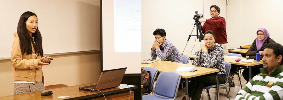 - 「アカデミックイングリッシュ」は1年次の学生を対象とした科目で、大学院での授業を遂行するために、アカデミックライティングに必要な基礎を学びます。また「論文英語」は2年次の学生が修士論文を書くためのトレーニングをします。開講科目の概要はこちらをご覧ください。