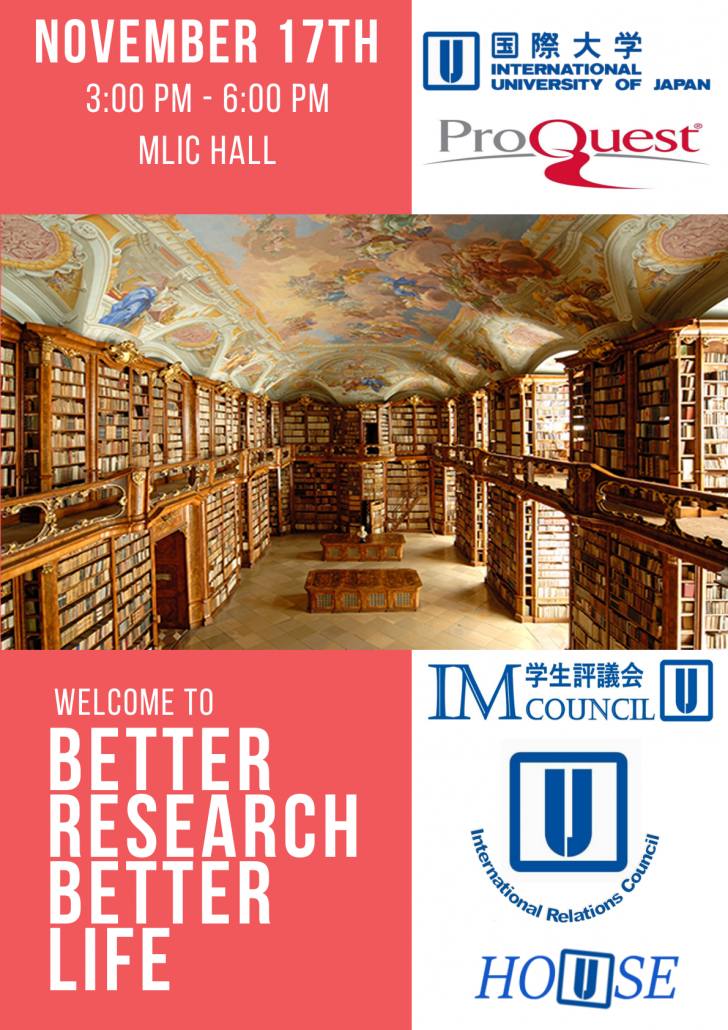 In partnership with ProQuest, IUJ Faculty, IM Council, IR Council, and IUJ Houses, IUJ Library is hosting the First and Biggest Event on Better Research Better Life this year.